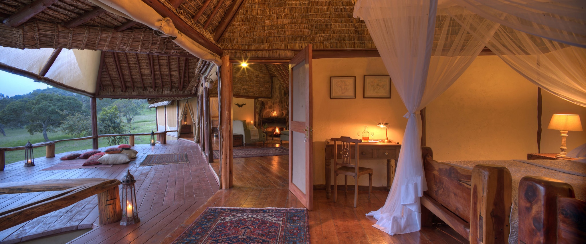 - Het familiehuis heeft twee ruime slaapkamers en een grote huiskamer met open haard en een veranda die uitkijkt over de Masai Mara
