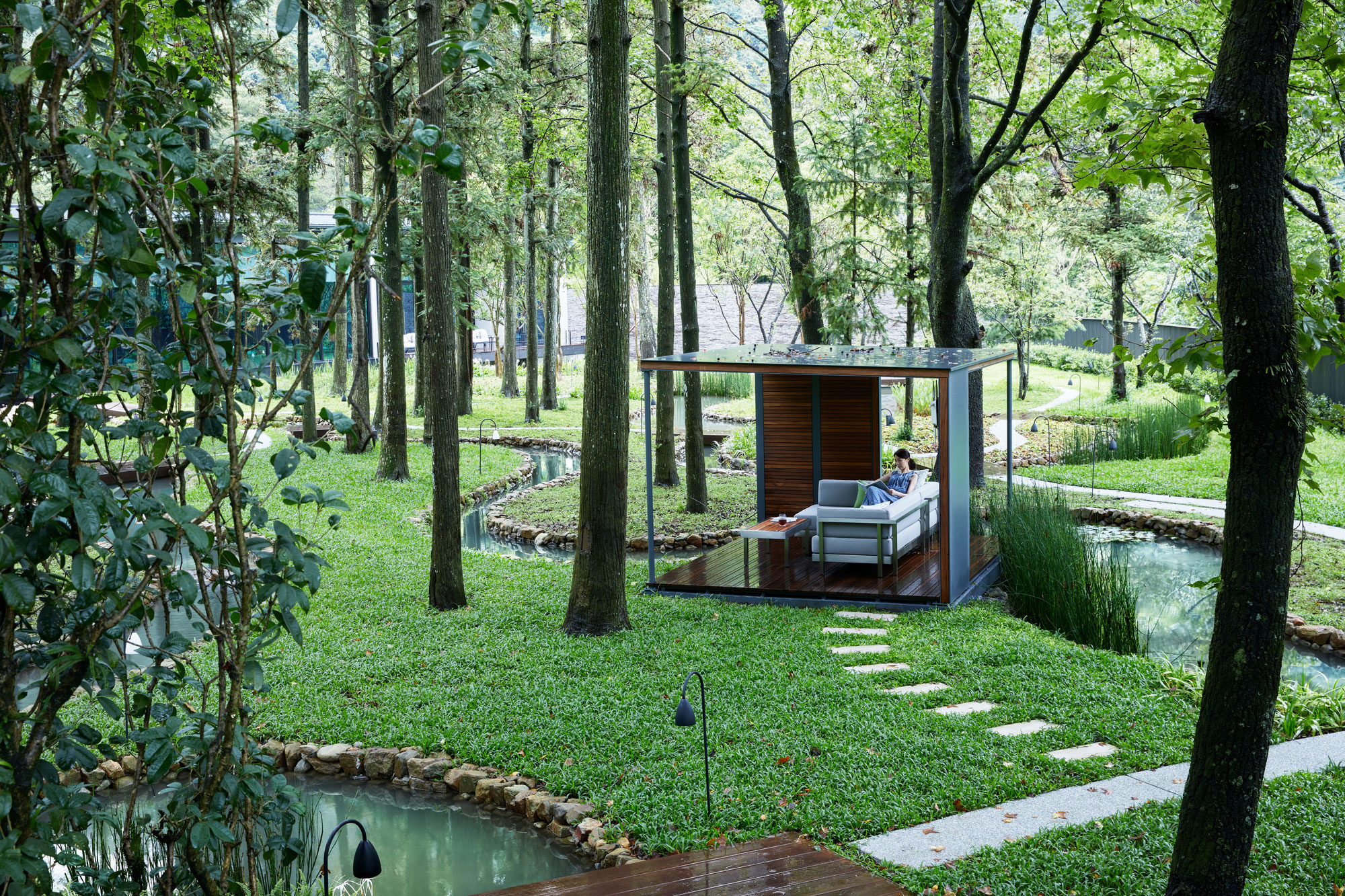 - In het midden van de tuin ligt een helderblauw zwembad, als een vijver diep in het bos, omringd door tuinhuisjes