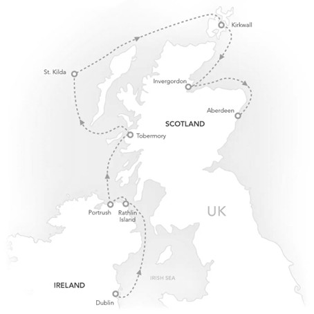 Vanuit het bruisende Dublin zet u koers naar Noord-Ierland langs de spectaculaire Antrimkust, met hoogtepunten zoals Giant’s Causeway en Dunluce Castle. Bezoek het kleurrijke Tobermory, een van de mooiste stadjes van Schotland, geniet van de lokale sfeer en de ruige natuur van het eiland Mull en proef er de exquise Tobermory Whisky. We verkennen de majestueuze natuur van St Kilda, de meest afgelegen buitenpost van Groot-Brittannië, met grote vogelkolonies. Verken Kirkwall en de Orkney-eilanden, dat doordrenkt is van oude mysteries uit de Steentijd en Vikingerfgoed, zoals Skara Brae en de Ring of Brodgar. Invergordon is toegangspoort tot de Schotse Hooglanden en het beroemde Loch Ness.