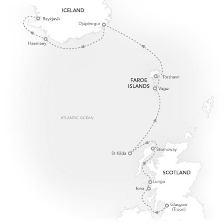 Ontdek ruige, ongerepte landschappen tijdens een indrukwekkende 10-daagse expeditiecruise langs de meest afgelegen eilanden van de Noord-Atlantische Oceaan. Vanuit het charmante Troon, nabij Glasgow, vaart de Ocean Victory naar Iona in de Binnen-Hebriden, bekend om zijn rijke Keltisch-christelijke erfgoed. Vervolgens reist u door naar Stornoway, het hart van Gaelic-sprekend Schotland, en bezoekt u het afgelegen St. Kilda, het meest geïsoleerde archipel van Groot-Brittannië en een unieke dubbele UNESCO-werelderfgoedlocatie. Hier vindt u spectaculaire vogelkolonies, waaronder enorme aantallen papegaaiduikers, jan-van-genten en het zeldzame St. Kilda-winterkoninkje. Where the world can't find you...
