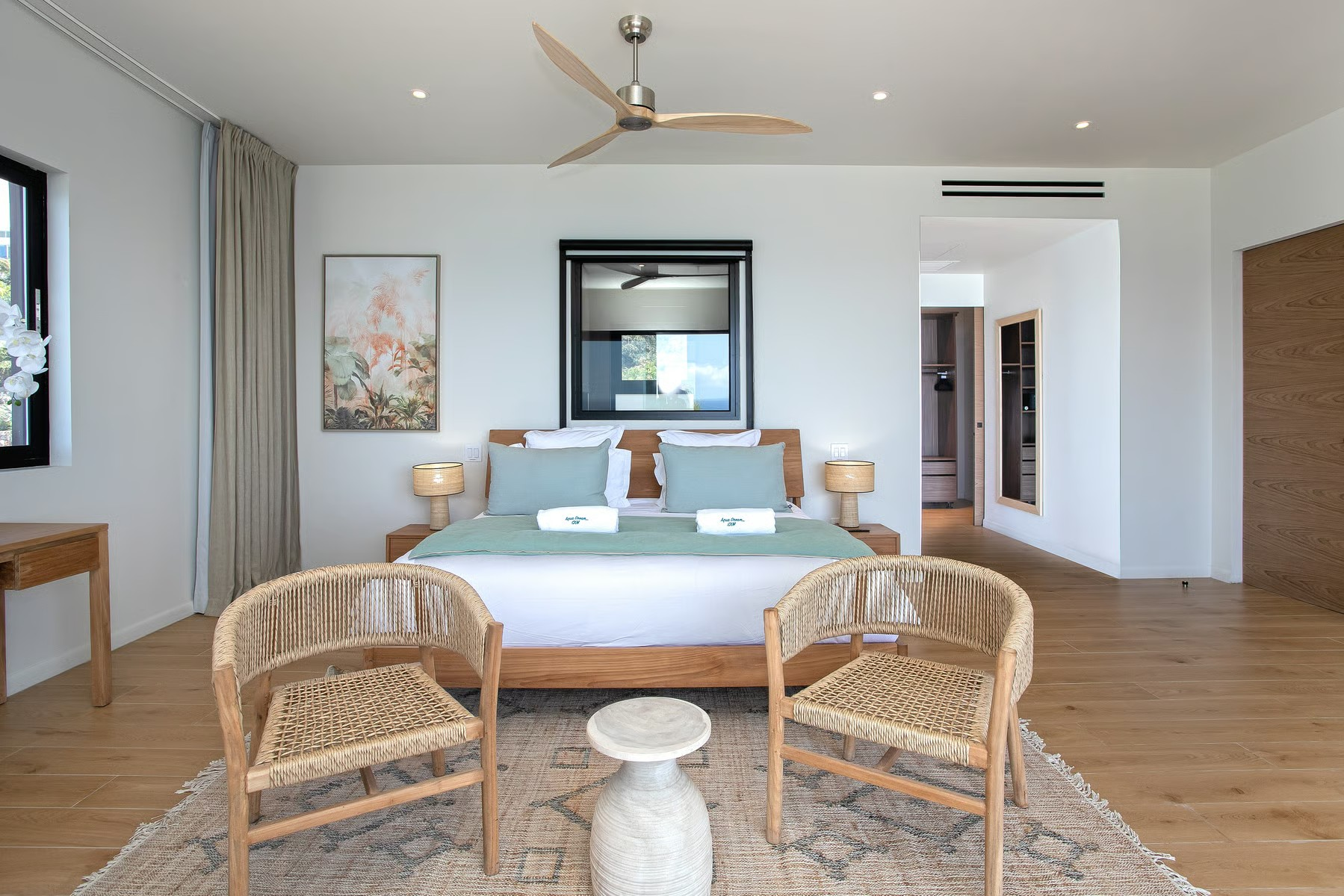 - The master bedroom of Villa Aqua Dream exudes pure beauty with an en-suite bathroom with a large bathtub and breathtaking sea views
