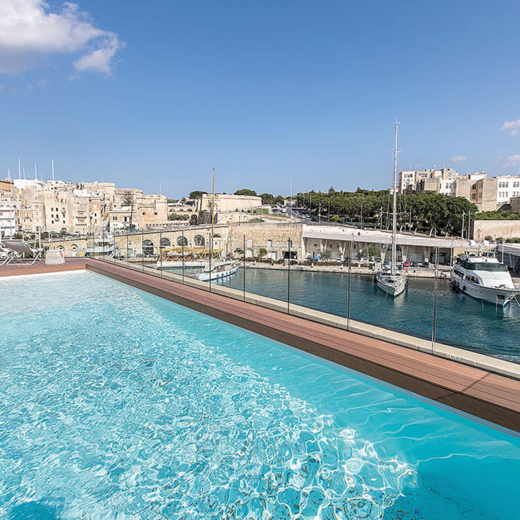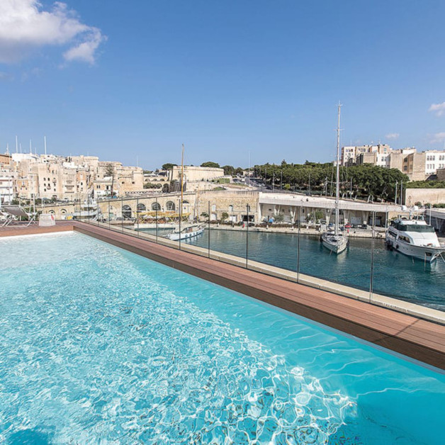 The Macina, a 16th-century historical fortress, was built in 1554 by the Order of St. John and was part of a bastion to protect Senglea from invaders in the following centuries. In 2018, Cugó Gran transformed the Macina into a Maltesehotel of allure. The historic fortifications are a brilliant contrast to the minimalist modern interior and the bespoke luxury décor. Tucked away on the roof of the bastion is a unique swimming pool that offers panoramic views of the "three cities" of Senglea, Cospicua, Vittoriosa, the Grand Harbour and, across the road, on Valletta. Relax in one of the loungers and let your gaze wander the Mediterranean surroundings. Dine Al fresco, an unforgettable experience in the warmer months when the imposing bastions, fortress town of Birgu and spectacular harbour are illuminated by the traditional Festa fireworks.